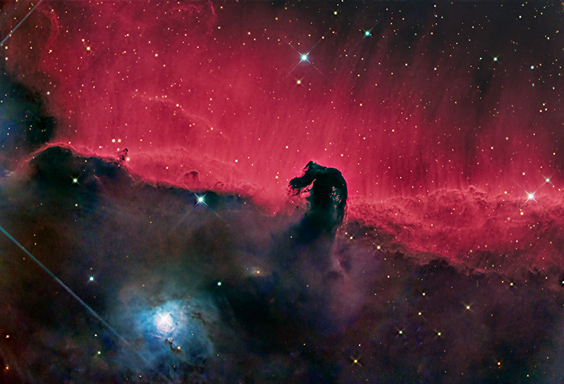 IC434というカタログ名は馬頭星雲背後の赤い散光星雲につけられたもので、馬頭星雲のカタログ名は暗黒星雲のカタログで「B33」になります。なお、馬頭星雲左下の星雲はNGC2023です。