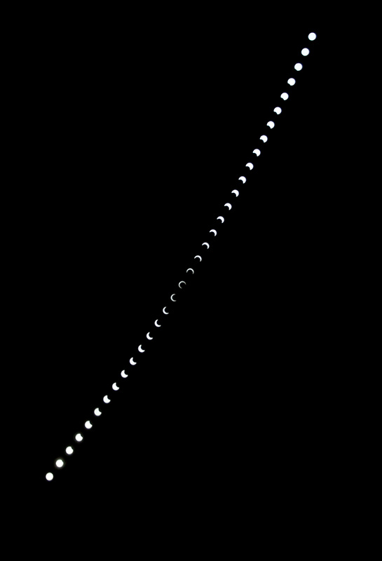 上記の望遠鏡による拡大写真と同時に、部分日食の全経過写真を撮影しました。最大食分の7時36分を中心に5分間隔で34コマを合成しています。(2021/07)