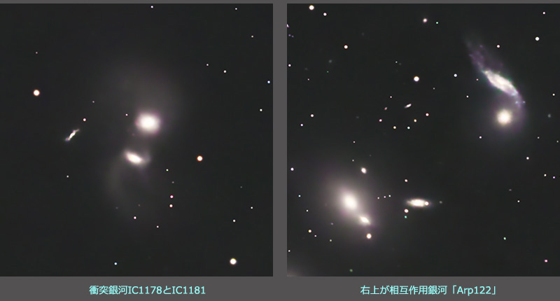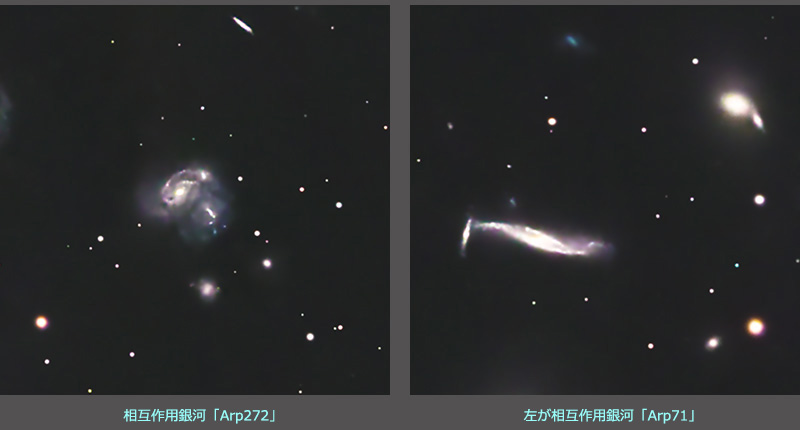 上の写真から「相互作用銀河」の部分を、ピクセル等倍近くに拡大した写真を4点掲載しました。この中で右上の写真「Arp71」の右上の渦巻銀河(NGC6043)と隣接する銀河は「相互作用銀河」なのか、同じ方向に見える銀河なのか不明です。