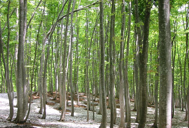新潟県十日町市にある「美人林(びじんばやし)」は、ブナの木々が真っ直ぐ空に向かって伸びる様子が美しいことから美人林と名付けられました。いったん伐採されて原野になった場所に、再び新芽から育ち始めたブナは樹齢90年ほどとのこと。新潟県十日町市といえば豪雪地帯、幹根元の若干の曲がりに豪雪の厳しさが感じられるものの、同じ樹齢のブナが真っ直ぐ育ち統制のとれた美しさがあります。十日町市松之山には他に日本自然百選に選ばれた「天水越(あまみずこし)のブナ林」が知られていますが、こちらは長野県境に近く原生林です。