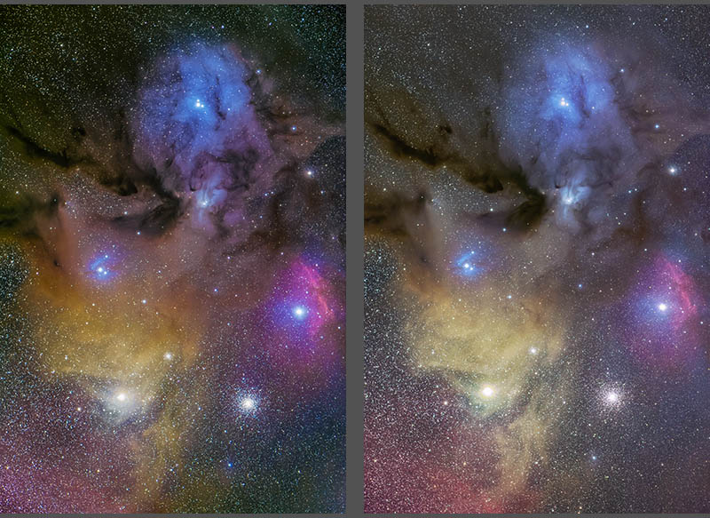 左写真はフラット補正せずに、ステライメージやフォトショップの機能を使い、できるだけ周辺減光補正した写真です右写真はフラットフレームにより処理したものです。