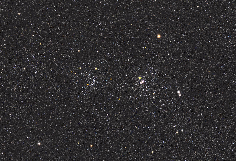 昨年撮影したペルセウス座の二重星団( h-χ 二重星団)を今年も狙いました。高校2年の時、自作した13㎝反射望遠鏡(凹面主鏡は旭精光)で見たイメージの写真を撮りたく、昨年よりも焦点距離の短い鏡筒を使いました。「周囲を無数の微星に囲まれた2つの星の集団」に近づいたように思います。カメラをフルサイズのニコンD810Aにすれば、さらに広範囲の写野になり2つの星団がより接近したのですが、今年は夜半でも気温が高いため冷却カメラを使いました。