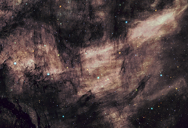 手前の黒く暗い分子雲(星間ガス雲、塵)が、背後の電離し発光しているIC5068に照らされ印象的な模様を見せています。さらに、この暗黒帯を注視し立体視すると暗黒帯が浮かび上がって見え、発光星雲を覆い隠している様子が見て取れます。