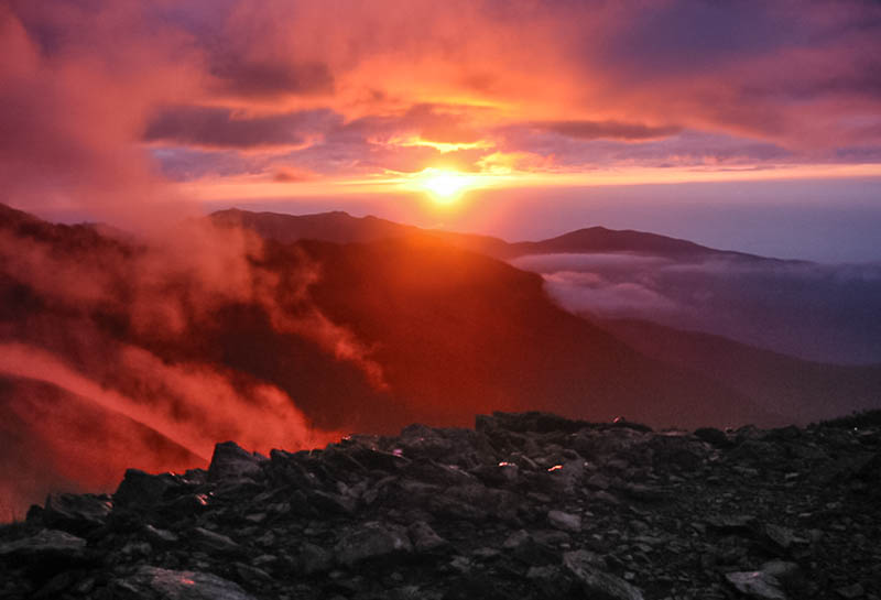 「北岳ご来光」としましたが、残念ながら北岳山頂は写真左手になります。北岳山荘を出発して間ノ岳方向へ30分ほど歩いたところで、「ご来光」です。(2017/08)