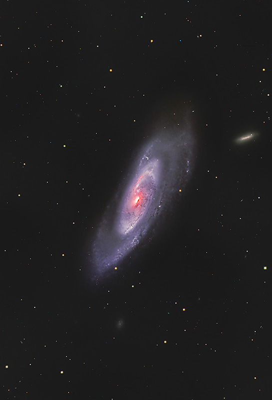 M106銀河は特異な形状を持つ銀河です。銀河円盤については内側が明るく外側は希薄な二重構造で、全体の姿は他の銀河との干渉で歪んでいます。さらに、中心コアの下側から左の方へ渦巻とは違う赤い炎のようなものが見えるでしょうか。活動が活発で中心から激しくガスを放出していると考えられています。