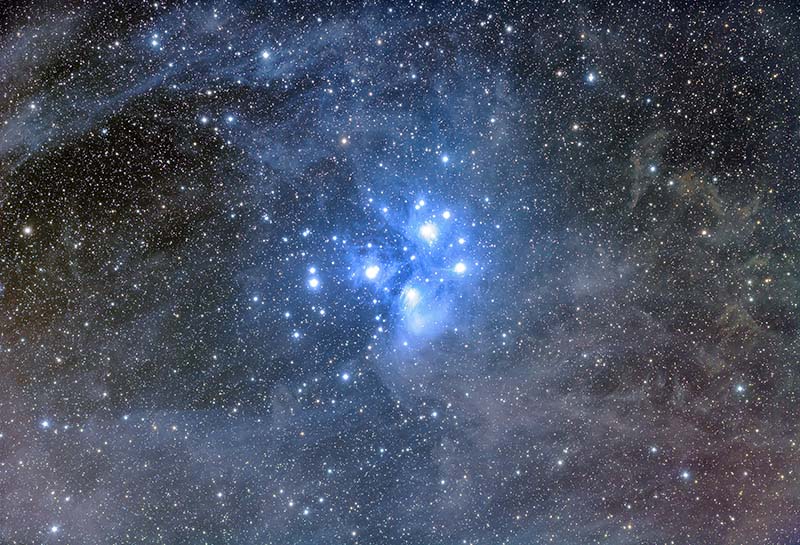 プレアデス星団はメシエカタログでM45、和名をすばるといい、「星はすばる」といわれるほど有名なおうし座にある散開星団です。肉眼でも5–7個、双眼鏡では60~70個確認できる約150個もの恒星の集団です。星団を構成する星は約6千万-1億歳と若いため青白く(高温の)輝き、また周囲に広がる星間ガスが青白く見えるのは、星間ガスが星団の光を反射しているためと考えられています。