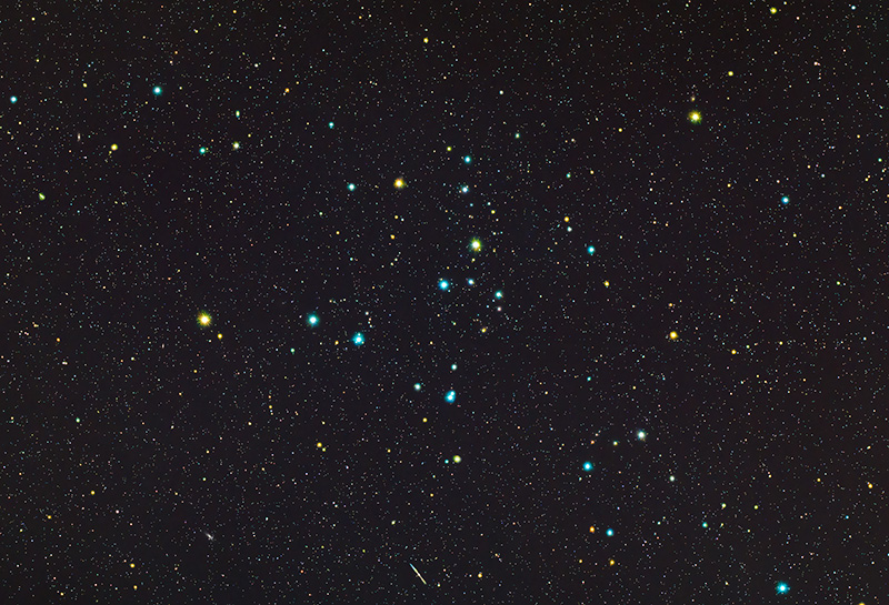 mel111散開星団は、星の数は30個ほどで双眼鏡の観望に適しています。写真中央左のオレンジ色の輝星γ星と右下の青色の23番星はこの星団のメンバーではないようです。この写真は天の北極が左方向になります。
