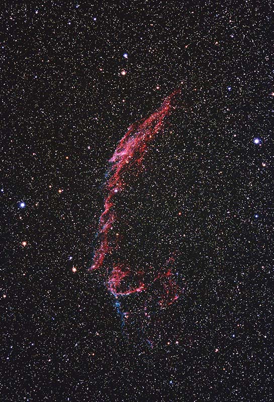 網状星雲は太陽より数倍の質量を持った恒星が、最後に大爆発(超新星爆発)を起こした星の残骸で、秒速100kmで膨張しています。全体の様子は写真「網状星雲」で確認できます。NGC6992は網状星雲全体の東側に位置しています。複雑に絡み合ったレース状のフィラメント構造が美しい天体です。(2017/09)