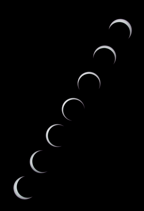 金環食を見れる地域へ遠征する予定でしたが、撮影候補地が軒並み悪天候の予報から遠征を断念。部分日食になりますが2回行ったリハーサル地で本番を迎えることとしました。予想どおり快晴に恵まれ、シュミレーションソフトによる撮影計画どおりに撮影できました。この写真は望遠鏡で拡大し3分間隔で撮影したものを1枚に合成しています。写真中央の7時36分撮影(4コマ目)が最大食分(太陽の欠けた割合)0.93の太陽です。撮影開始直前まで赤道儀で太陽を画面左下で追尾し、撮影時は固定に切り替え太陽の動きと食の変化を撮影しました。