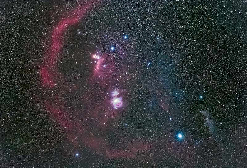 オリオン座の三ツ星付近から南側を100mmレンズでねらいました。三ツ星の下に馬頭星雲とオリオン大星雲、三ツ星の東側を取りかこむように赤く広がっているバーナードループを確認できます。バーナードループは星の最後の姿で、約200万年前に起きた超新星爆発の残骸と考えらています。右下に輝星リゲルの光に照らされた魔女の横顔が見えます。(2017/09)
