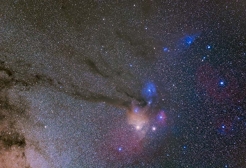 さそり座の一等星「アンタレス」を取り巻く散光星雲群から、天の川銀河中心部につながる暗黒帯を、一眼カメラの望遠レンズと天文専用冷却CCDカメラで狙いました。写真「バルジ」ではさらに広範囲に、「アンタレス付近」は散光星雲群をクローズアップしています。