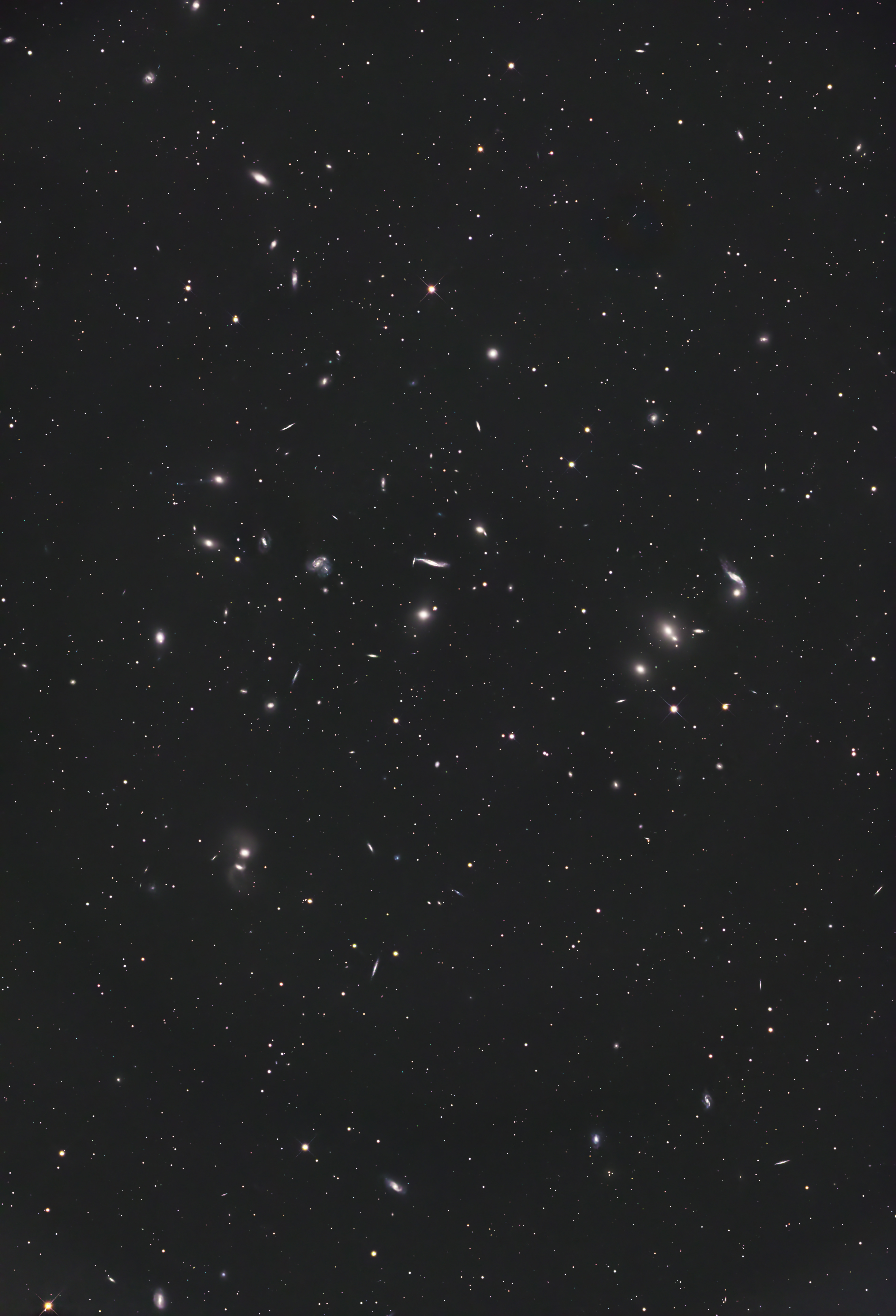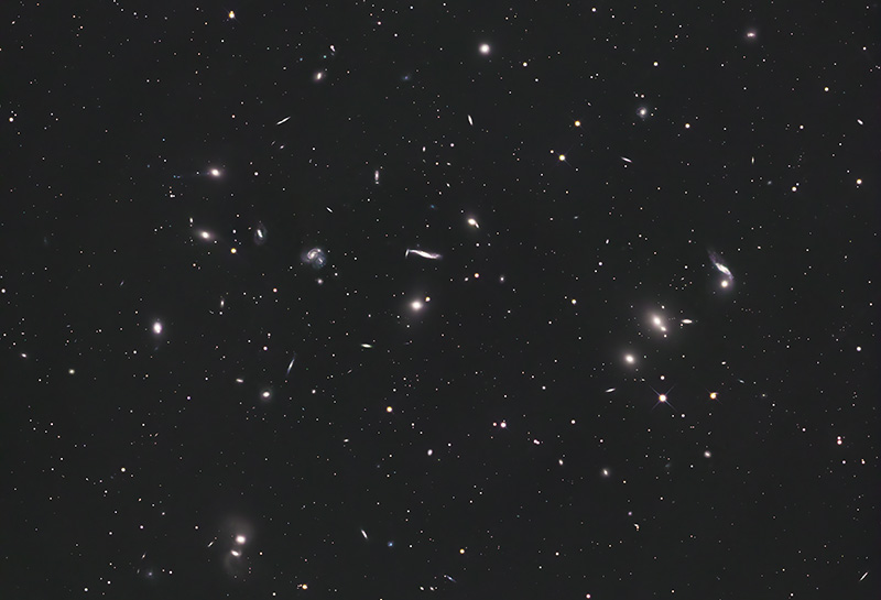 光で5億年かかる距離にあるヘルクレス座銀河団です。多数の銀河が密集している銀河の大集団を銀河団といいますが、ヘルクレス座銀河団は半径600万光年の中に約360以上の銀河がひしめき合っていると考えられています。銀河団の天体カタログAbell(エイベル)の2151番になります。この写真では恒星に見える天体も銀河であるものが相当多くあります。