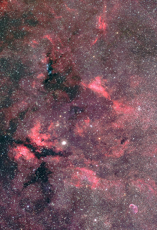 プロペラ星雲からクレセント星雲までの広範囲を撮影するため、VSD100F3.8鏡筒にレデューサーV0.79Xを併用し、焦点距離300㎜で狙いました。夜が短かい時期でしたので2箇所での撮影になりましたが、撮影視野を合致させるのに神経を使いました。また、レデューサーを用いた場合、乾燥空気の送風ができないため、受光面の凍結を防ぐのに冷却温度を0℃としました。心配したノイズは目立たないようです。(2017/07)