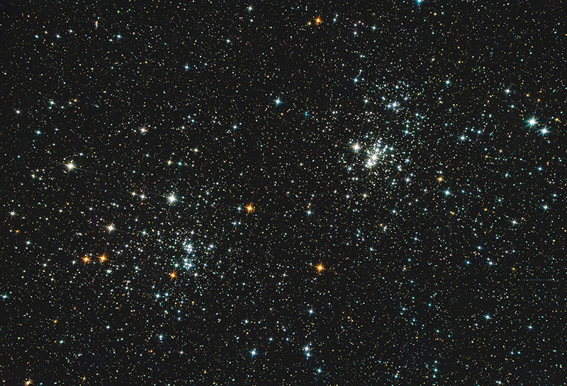 今回は、1回目と同じ機材で写真の左右が窮屈になった反省を生かし、二重星団が 対角線に配置されるようにカメラを回転させて撮影しました。