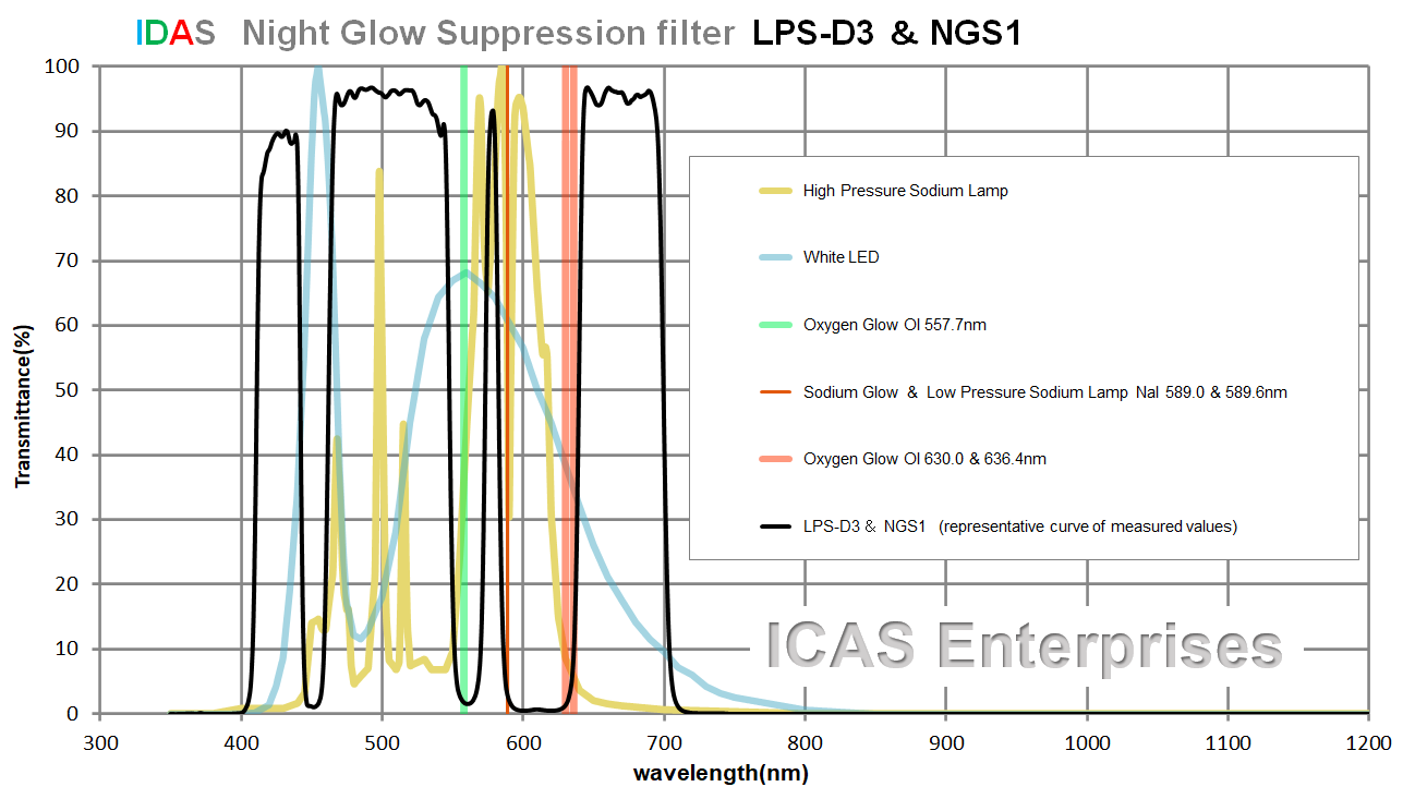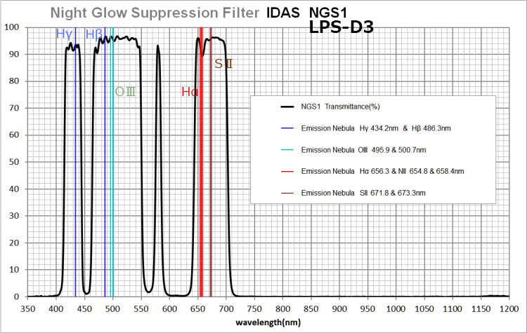 2枚の特性図からLPS-D3フィルターは、従来の照明光より遥かに厄介な光害源であるLED光を遮断し、天体が発する輝線を通過させるように設計されているのが分かります。