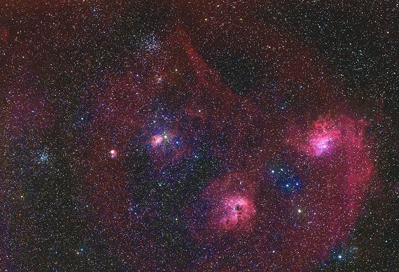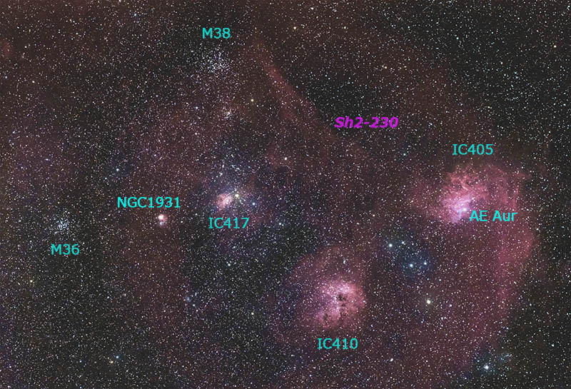 ぎょしゃ座にはメシエ番号の付けられた3つの散開星団M36・M37・M38がありますが、写真ではM36とM38が見えます。星雲の代表格は何といってもIC405とIC410でしょう。IC405はその形状から勾玉(まがたま)星雲と呼ばれていますが、フレーミング・スター星雲(燃え上がる星-星雲)とも呼ばれます。IC405・IC410とIC417やNGC1931を含めた広範囲を、銀河系内のHⅡ領域を登録したカタログであるシャープレスカタログでは