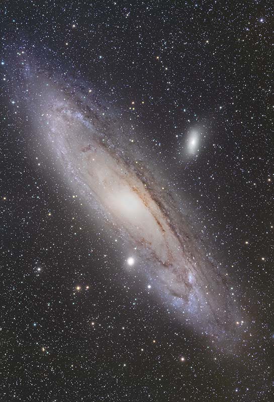 アンドロメダ銀河は、私たちの住む天の川銀河のとなり230万光年の距離に位置し、言わずと知れた超有名天体です。大きさは満月の約5倍ほどありますが、肉眼では中心部の明るい部分だけが雲のように見えます。双眼鏡で観測すれば楕円形の光芒を確認することができます。写真中央のアンドロメダ銀河はメシエカタログでM31、中央右上の光芒がM110、中央下の小さな光芒がM32で、いずれも銀河です。M110とM32銀河はアンドロメダ銀河の伴銀河で相互作用していると考えられています。M110銀河とアンドロメダ銀河間に非常に淡い光の星間ガスが見えるのは、この相互作用によるものでしょうか。