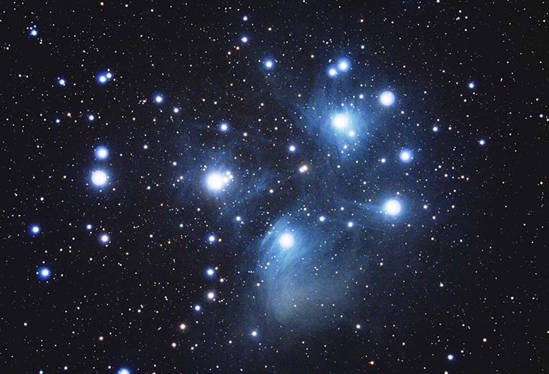 プレアデス星団はメシエカタログでM45、和名をすばるといい、「星はすばる」といわれるほど有名なおうし座にある散開星団です。肉眼でも5–7個、双眼鏡では60~70個確認できる約150個もの恒星の集団です。星団を構成する星は約6千万-1億歳と若いため青白く(高温の)輝き、また周囲に広がる星間ガスが青白く見えるのは、星間ガスが星団の光を反射しているためと考えられています。