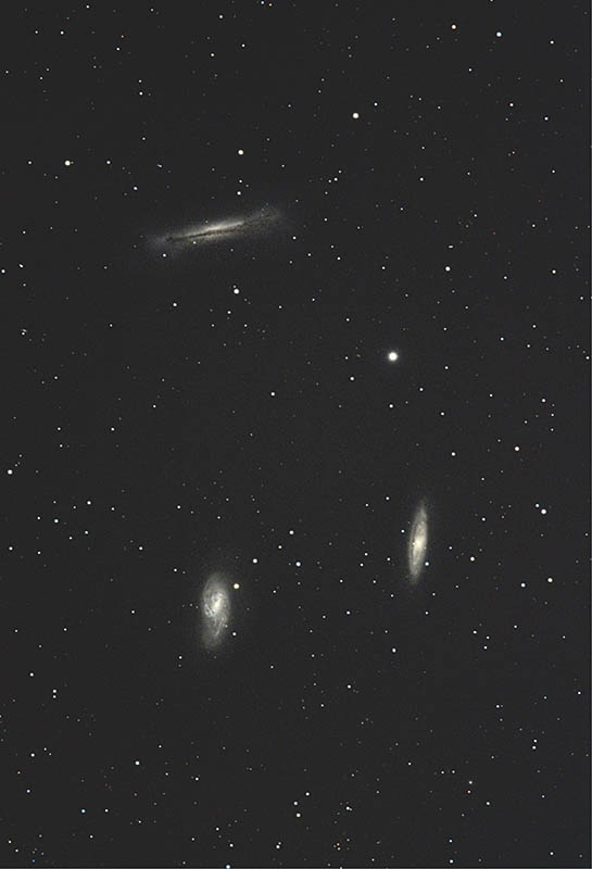 2150万光年とほぼ同じで、しし座銀河団を形成しています。右下がM65、左下がM66、上の横長く暗黒帯の目立つ銀河がNGC3628です。同じ渦巻銀河ですが、見る方向で形や色の微妙な違いが人気の所以かもしれません。(2017/11)