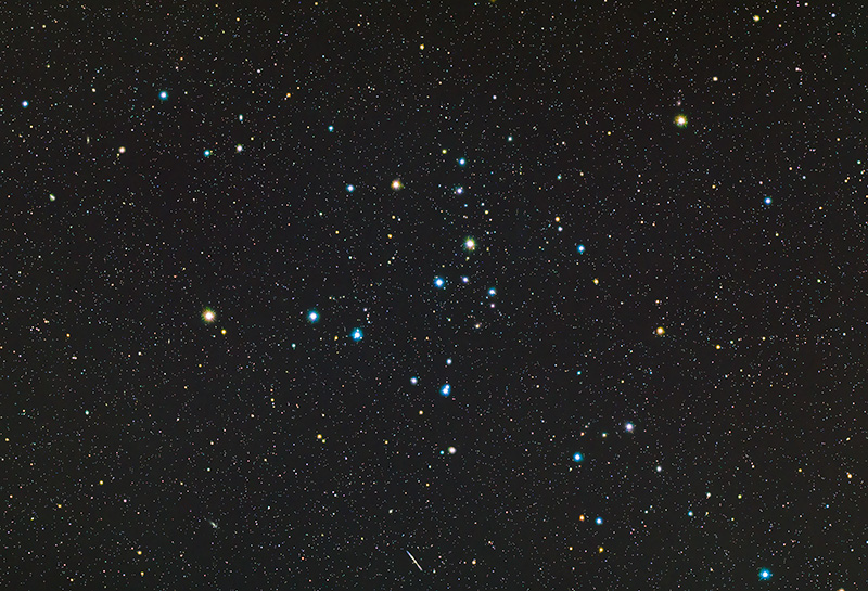 mel111散開星団は、星の数は30個ほどで双眼鏡の観望に適しています。写真中央左のオレンジ色の輝星γ星と右下の青色の23番星はこの星団のメンバーではないようです。この写真は天の北極が左方向になります。