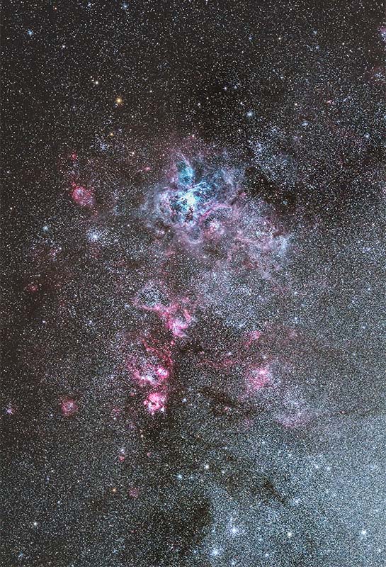 南半球の空に浮かぶ大小マゼラン雲。その大マゼラン雲の先頭にある巨大な赤い星雲がタランチュラ星雲(毒グモ星雲)と呼ばれています。最も明るく見える部分がクモの足に見えることから名付けられました。タランチュラ星雲は非常に巨大な星形成領域で、私たちに馴染みのオリオン大星雲の星形成領域(30光年)の30倍以上とも言われています。そこから誕生した散開星団NGC2070とその中心領域のR136は、けた外れの星の数と巨大星で知られています。