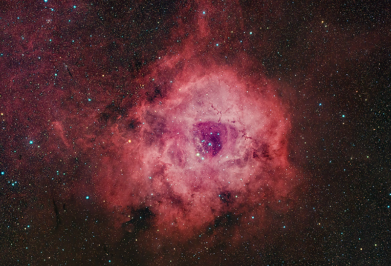 「胎児星雲」に記しましたが、アイダス のLPS-D3フィルターは使い勝手がいいです。この写真も1夜の撮影で、鏡筒の向いている方向にLED街路灯があったのですが、バラ星雲周りの赤いガス雲もしっかり抽出でき、星色も良好にでています。これはLPS-D3フィルターの恩恵だけでなく、上記の処理ソフト群のチカラによるものです。
