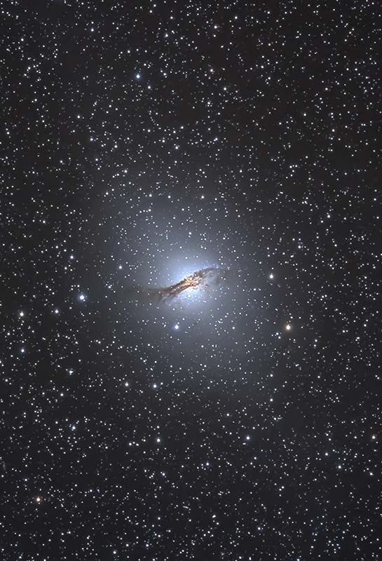 2011年のオーストラリア遠征時に同時撮影した他天体の露出時間5分に比べ、ケンタウルス座Aは10分露出しました。この遠征を企画された方のアドバイスが適切で、大きく斜めに伸びる光芒も捉えることができました。(2017/09)