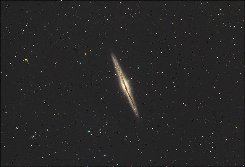 私たちが住む天の川銀河のような渦巻銀河を横から見た銀河をエッジオン銀河と言いますが、その代表格の一つであるアンドロメダ座にあるNGC891銀河です。下のトリミングの無い写真には他に5個程度の銀河と、NGC891銀河に寄り添うように伴銀河らしきものが2天体確認できます。春と秋の星座は遠くの銀河を見通せるため銀河撮影のチャンスです。