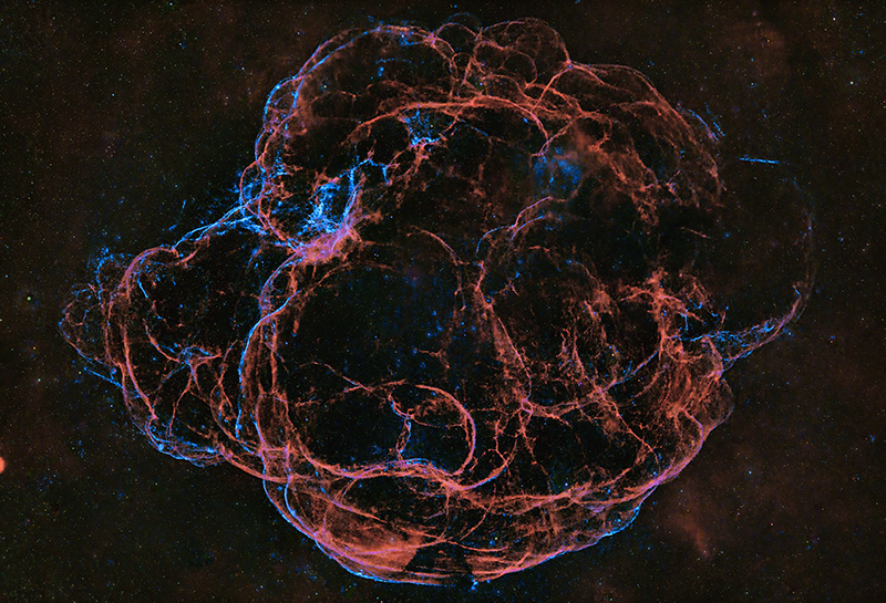 満月6個分の大きさ(200×180′)があり非常に淡い超新星残骸Sh2-240は、おうし座とぎょしゃ座の境界にあります。以前にも撮影していて「Sh2-240超新星残骸」としてアップしてあります。この時はASI 2600MM ProモノクロカメラによるHOO合成写真でしたが、今回はOptolong L-ultimateフィルターを装着したASI