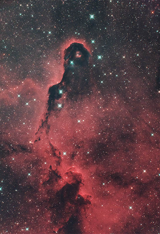 ケフェウス座にある大型の散光星雲「IC1396」の中央右側にある「象の鼻」に似た暗黒帯(分子雲)を、長焦点望遠鏡で狙い縦構図にしました。反射星雲を集めたファン・デン・ベルグカタログではvdB142と命名されています。暗黒帯が背後の赤い散光星雲に重なって浮かび上がり、暗黒星雲のエッジが赤く発光する「ブライトリム雲」の様子もわかります。象の鼻星雲の内部には原始星(生まれたての星)が多数存在していることが知られています。