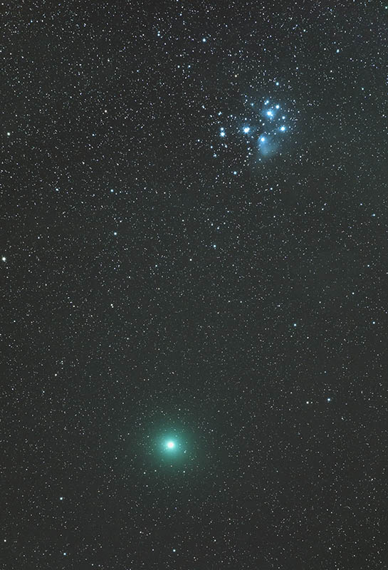 すばる星団(プレアデス星団)の近くを通過するウィルタネン彗星です。